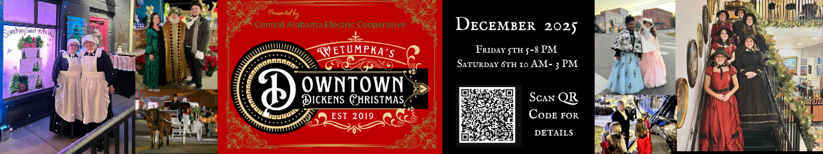 Wetumpka's Downtown Dickens Christmas returns on the first weekend in December, Friday 5th from 5-8 PM and Saturday, 6th from 10 AM-3 PM.